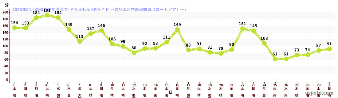• ドラえもん XRライド ~のび太と空の理想郷(ユートピア)~$B$N(B2023年04月01日のの一日平均待ち時間