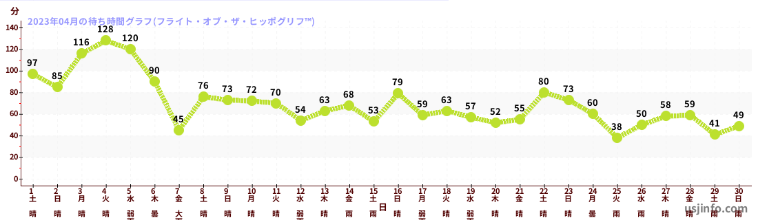 • フライト・オブ・ザ・ヒッポグリフ™$B$N(B2023年04月01日のの一日平均待ち時間
