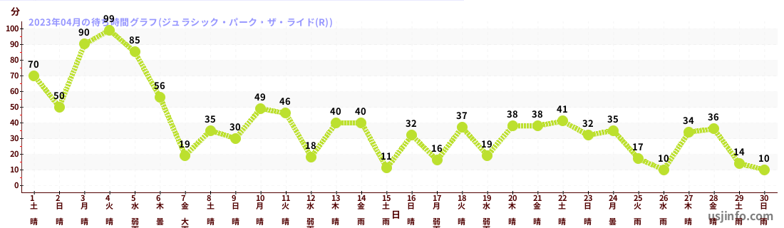 • ジュラシック・パーク・ザ・ライド(R)$B$N(B2023年04月01日のの一日平均待ち時間