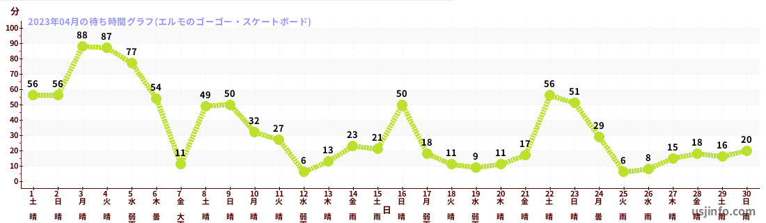 • エルモのゴーゴー・スケートボード$B$N(B2023年04月01日のの一日平均待ち時間