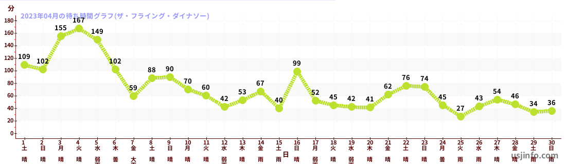 • ザ・フライング・ダイナソー$B$N(B2023年04月01日のの一日平均待ち時間