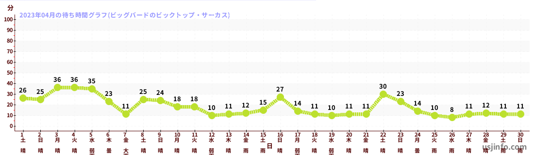 • ビッグバードのビックトップ・サーカス$B$N(B2023年04月01日のの一日平均待ち時間