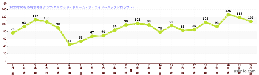 • ハリウッド・ドリーム・ザ・ライド〜バックドロップ〜$B$N(B2023年05月01日のの一日平均待ち時間