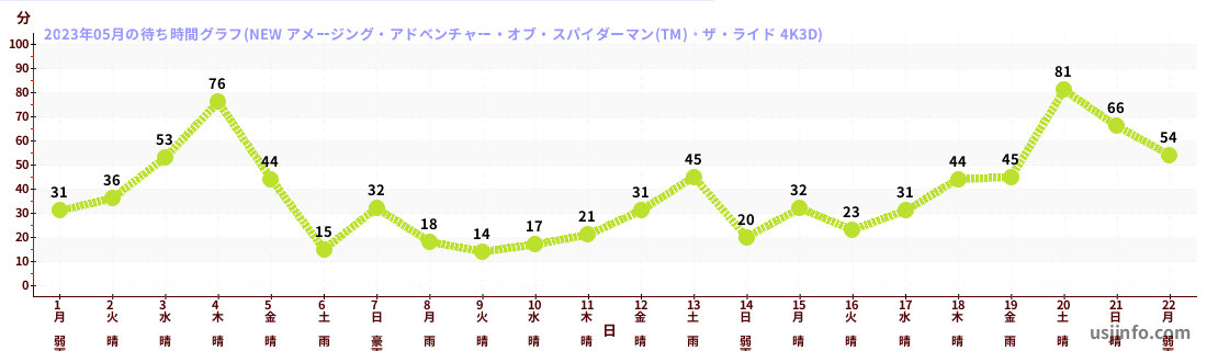 • NEW アメージング・アドベンチャー・オブ・スパイダーマン(TM)・ザ・ライド 4K3D$B$N(B2023年05月01日のの一日平均待ち時間