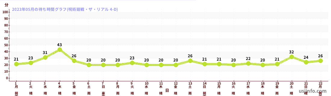 • 呪術廻戦・ザ・リアル 4-D$B$N(B2023年05月01日のの一日平均待ち時間