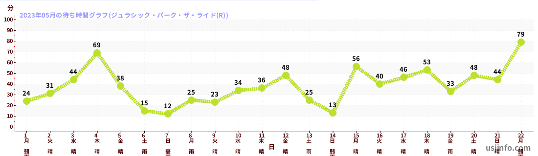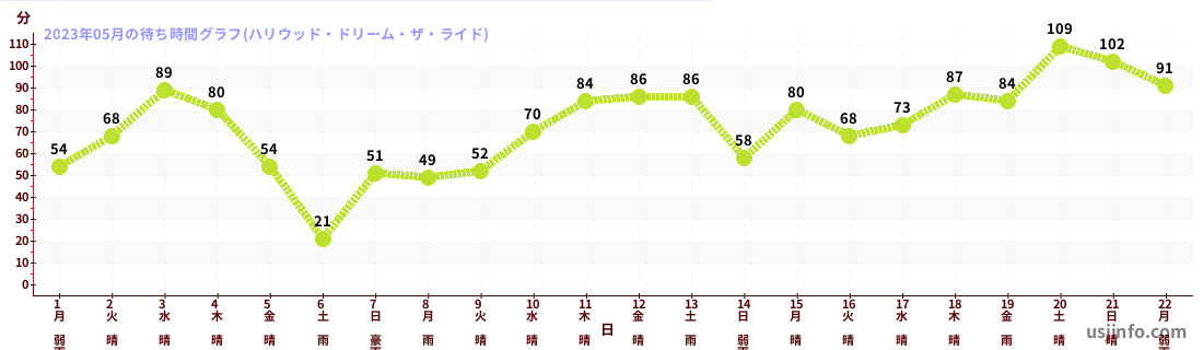 • ハリウッド・ドリーム・ザ・ライド$B$N(B2023年05月01日のの一日平均待ち時間