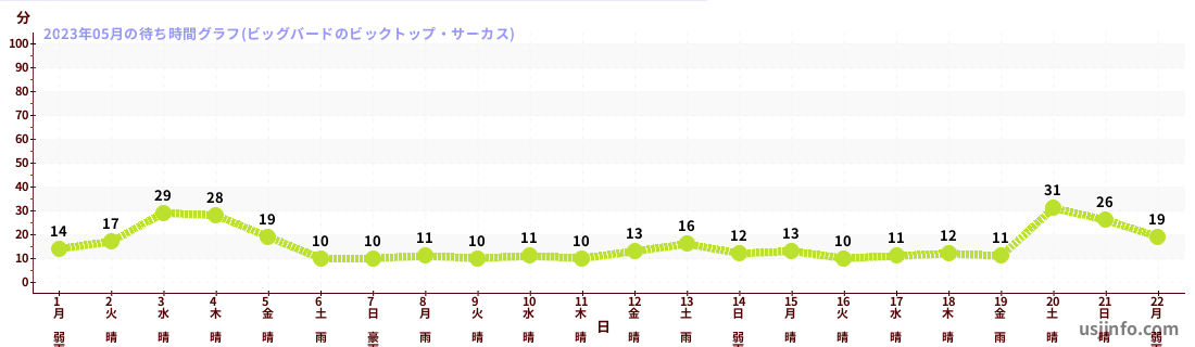 • ビッグバードのビックトップ・サーカス$B$N(B2023年05月01日のの一日平均待ち時間