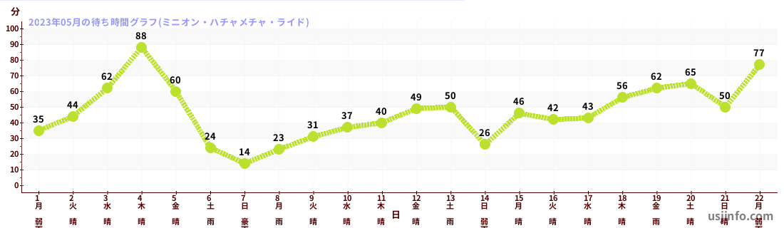 • ミニオン・ハチャメチャ・ライド$B$N(B2023年05月01日のの一日平均待ち時間