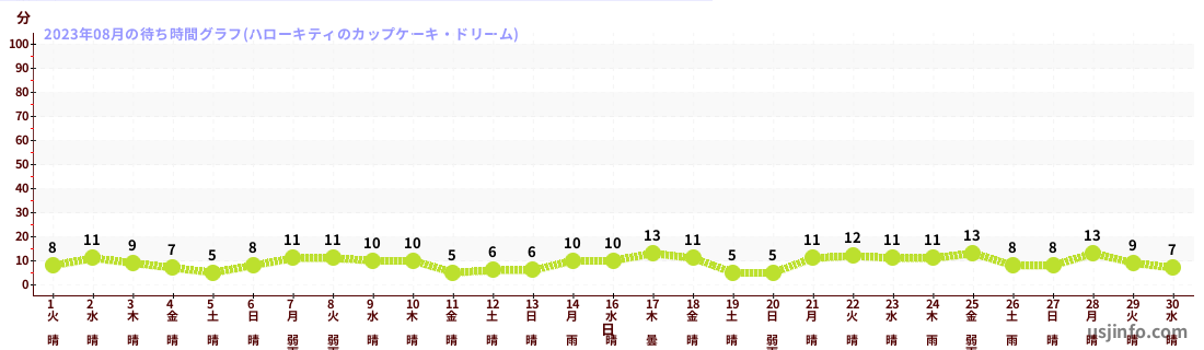 • ハローキティのカップケーキ・ドリーム$B$N(B2023年08月01日のの一日平均待ち時間