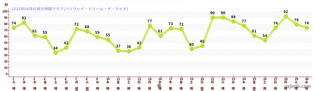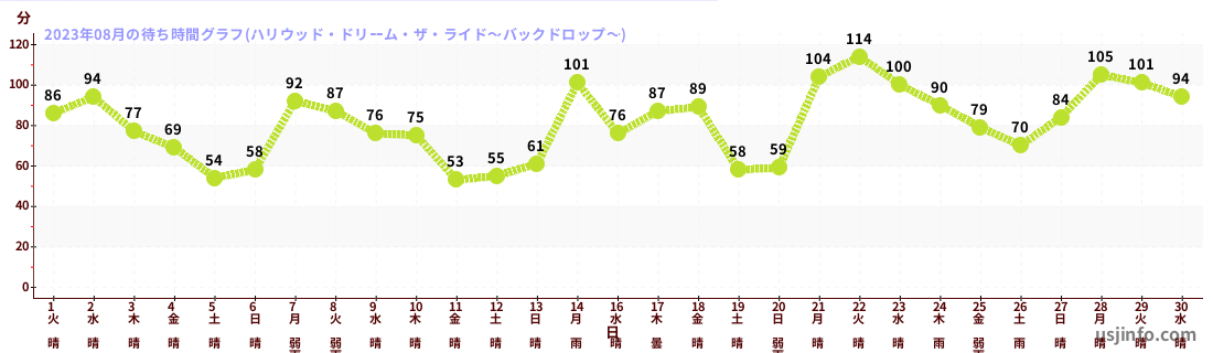 • ハリウッド・ドリーム・ザ・ライド$B$N(B2023年08月01日のの一日平均待ち時間