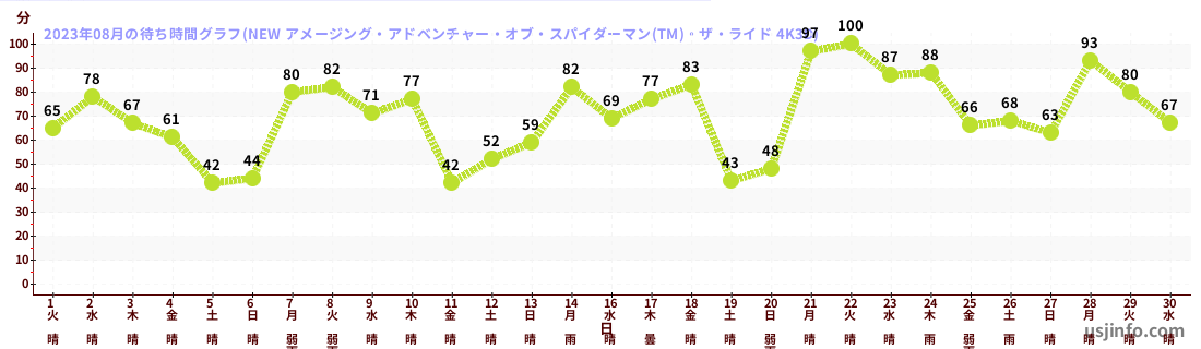 • NEW アメージング・アドベンチャー・オブ・スパイダーマン(TM)・ザ・ライド 4K3D$B$N(B2023年08月01日のの一日平均待ち時間