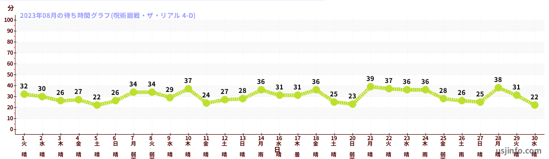 • 呪術廻戦・ザ・リアル 4-D$B$N(B2023年08月01日のの一日平均待ち時間