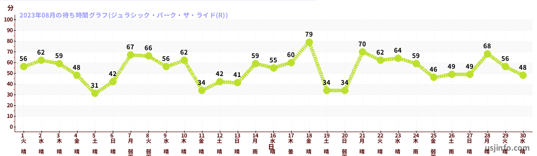 • ジュラシック・パーク・ザ・ライド(R)$B$N(B2023年08月01日のの一日平均待ち時間
