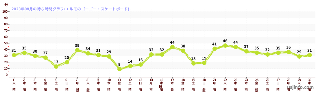 • エルモのゴーゴー・スケートボード$B$N(B2023年08月01日のの一日平均待ち時間