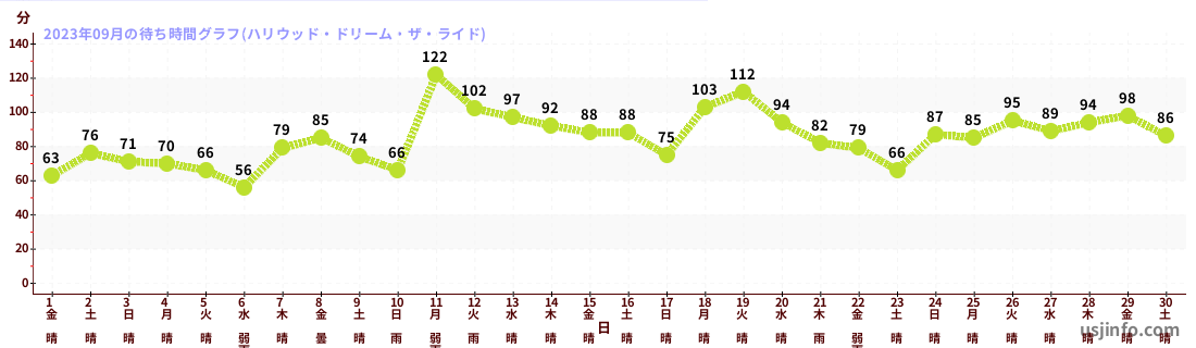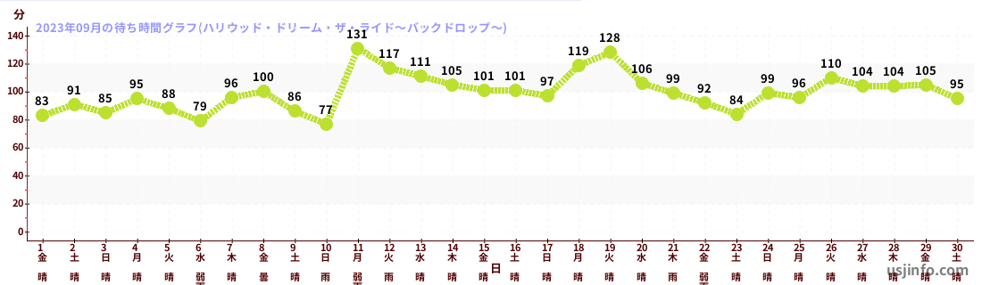 • ハリウッド・ドリーム・ザ・ライド$B$N(B2023年09月01日のの一日平均待ち時間
