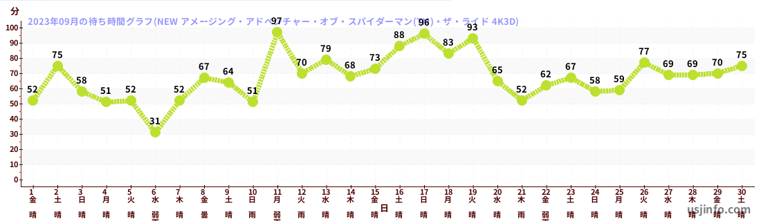 • NEW アメージング・アドベンチャー・オブ・スパイダーマン(TM)・ザ・ライド 4K3D$B$N(B2023年09月01日のの一日平均待ち時間