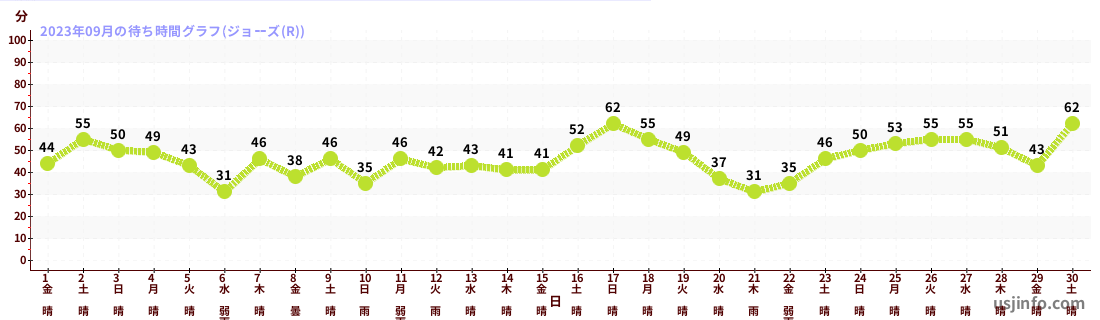• ジョーズ(R)$B$N(B2023年09月01日のの一日平均待ち時間