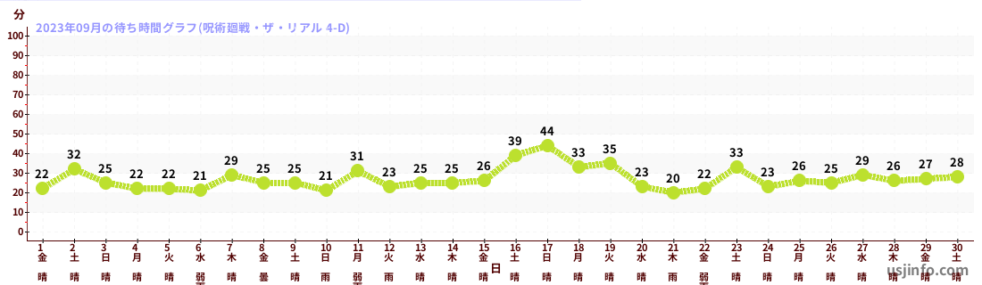 • 呪術廻戦・ザ・リアル 4-D$B$N(B2023年09月01日のの一日平均待ち時間