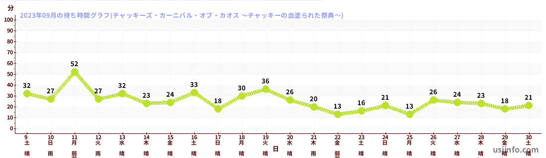 • チャッキーズ・カーニバル・オブ・カオス ~チャッキーの血塗られた祭典~$B$N(B2023年09月01日のの一日平均待ち時間