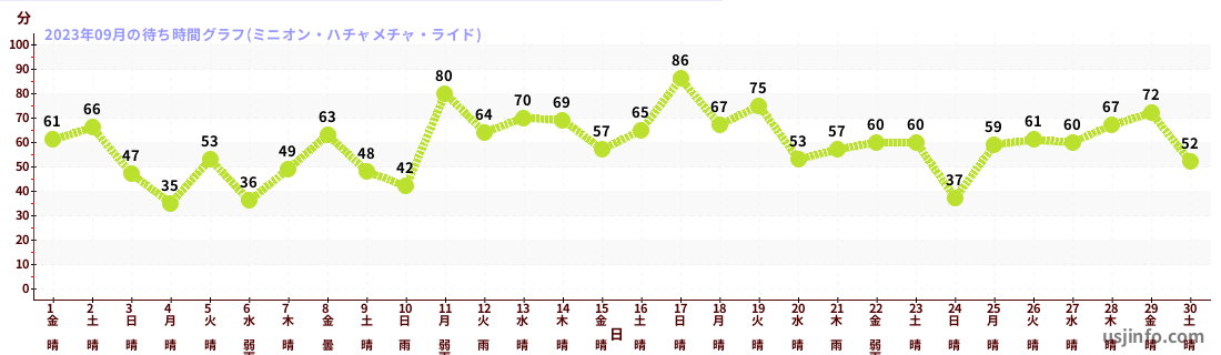 • ミニオン・ハチャメチャ・ライド$B$N(B2023年09月01日のの一日平均待ち時間
