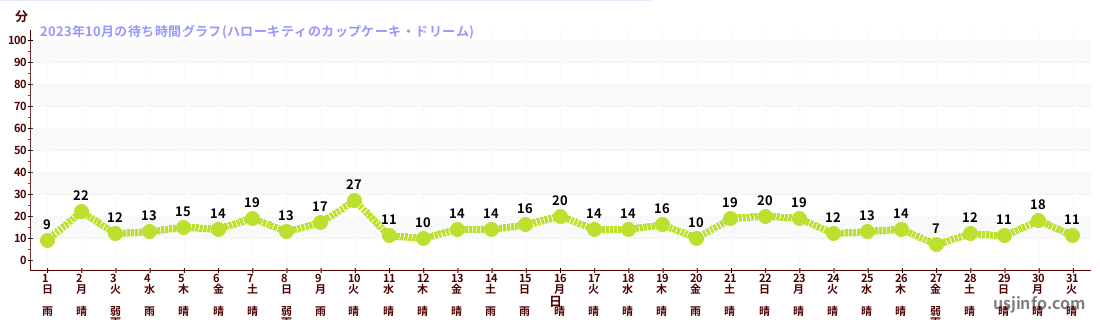 • ハローキティのカップケーキ・ドリーム$B$N(B2023年10月01日のの一日平均待ち時間