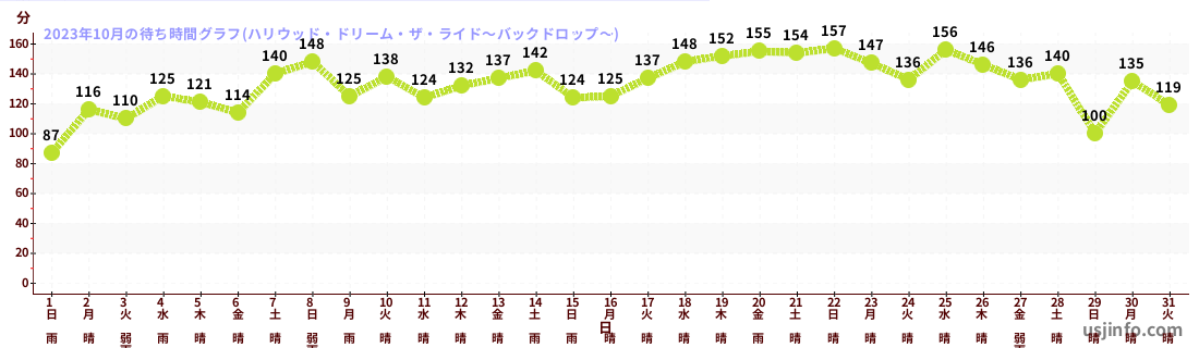 • ハリウッド・ドリーム・ザ・ライド〜バックドロップ〜$B$N(B2023年10月01日のの一日平均待ち時間
