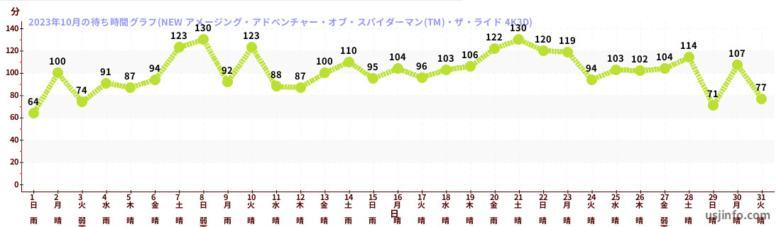 • NEW アメージング・アドベンチャー・オブ・スパイダーマン(TM)・ザ・ライド 4K3D$B$N(B2023年10月01日のの一日平均待ち時間