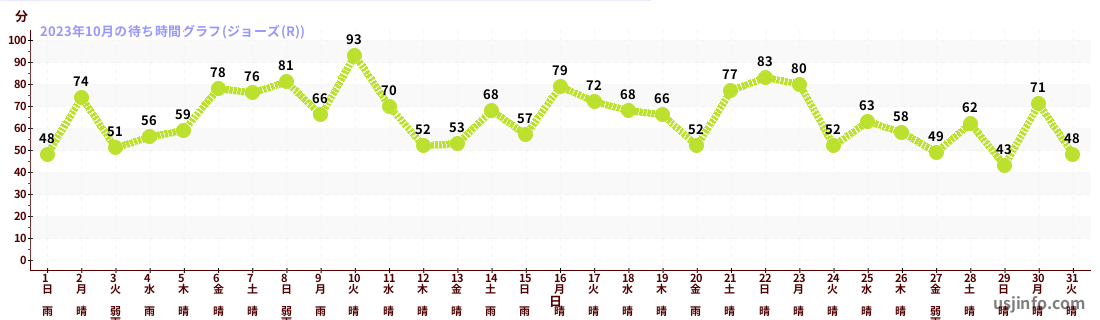 • ジョーズ(R)$B$N(B2023年10月01日のの一日平均待ち時間