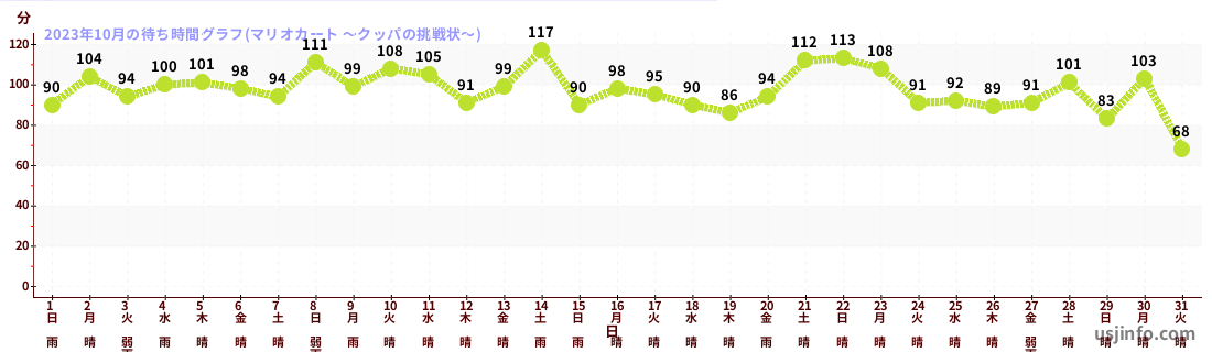 • マリオカート ~クッパの挑戦状~$B$N(B2023年10月01日のの一日平均待ち時間