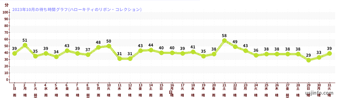 • ハローキティのリボン・コレクション$B$N(B2023年10月01日のの一日平均待ち時間