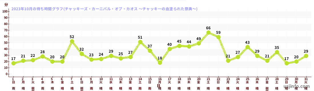 • チャッキーズ・カーニバル・オブ・カオス ~チャッキーの血塗られた祭典~$B$N(B2023年10月01日のの一日平均待ち時間