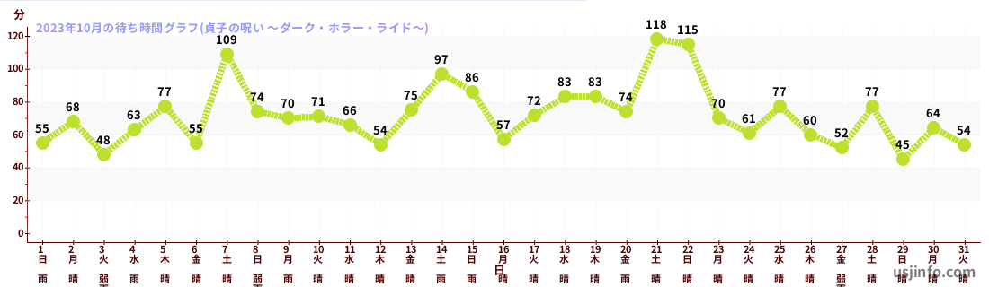 • 貞子の呪い ~ダーク・ホラー・ライド~$B$N(B2023年10月01日のの一日平均待ち時間