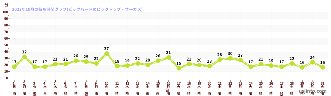 • ビッグバードのビックトップ・サーカス$B$N(B2023年10月01日のの一日平均待ち時間