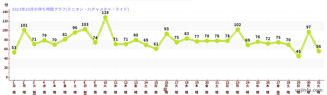 • ミニオン・ハチャメチャ・ライド$B$N(B2023年10月01日のの一日平均待ち時間