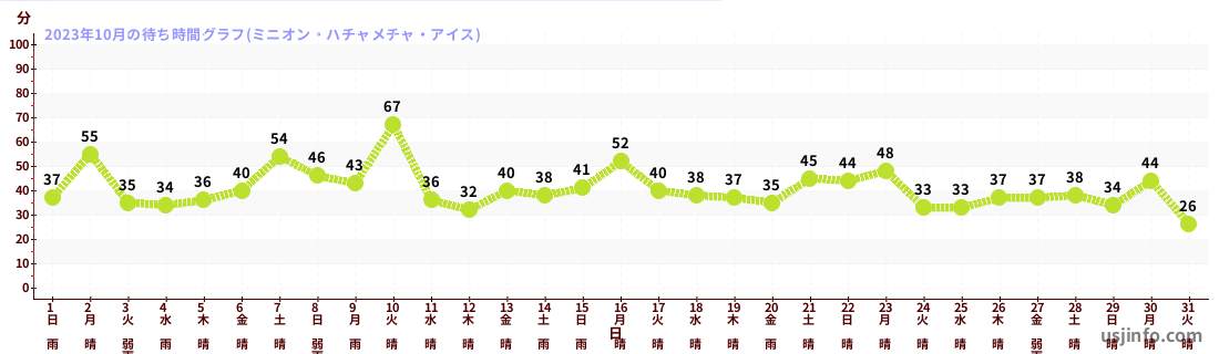 • ミニオン・ハチャメチャ・アイス$B$N(B2023年10月01日のの一日平均待ち時間