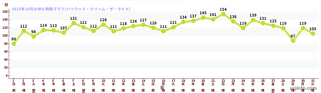 • ハリウッド・ドリーム・ザ・ライド$B$N(B2023年10月01日のの一日平均待ち時間