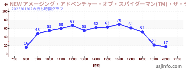 • NEW アメージング・アドベンチャー・オブ・スパイダーマン(TM)・ザ・ライド 4K3D$B$N(B2023年01月02日の待ち時間