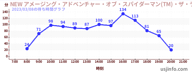 • NEW アメージング・アドベンチャー・オブ・スパイダーマン(TM)・ザ・ライド 4K3D$B$N(B2023年03月08日の待ち時間