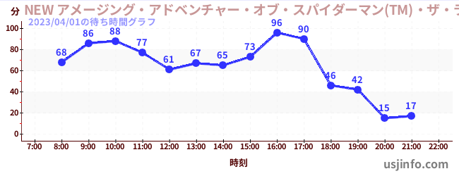 • NEW アメージング・アドベンチャー・オブ・スパイダーマン(TM)・ザ・ライド 4K3D$B$N(B2023年04月01日の待ち時間
