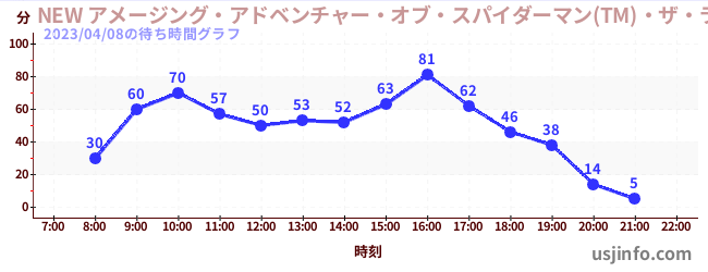 • NEW アメージング・アドベンチャー・オブ・スパイダーマン(TM)・ザ・ライド 4K3D$B$N(B2023年04月08日の待ち時間