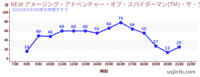 • NEW アメージング・アドベンチャー・オブ・スパイダーマン(TM)・ザ・ライド 4K3D$B$N(B2023年04月22日の待ち時間
