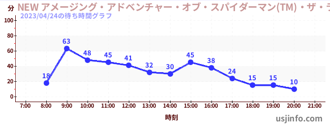 • NEW アメージング・アドベンチャー・オブ・スパイダーマン(TM)・ザ・ライド 4K3D$B$N(B2023年04月24日の待ち時間