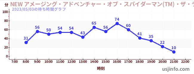 • NEW アメージング・アドベンチャー・オブ・スパイダーマン(TM)・ザ・ライド 4K3D$B$N(B2023年05月03日の待ち時間
