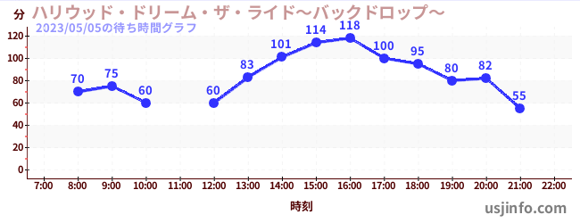 • ハリウッド・ドリーム・ザ・ライド〜バックドロップ〜$B$N(B2023年05月05日の待ち時間