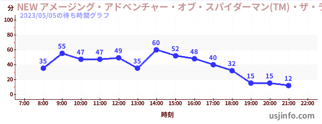 • NEW アメージング・アドベンチャー・オブ・スパイダーマン(TM)・ザ・ライド 4K3D$B$N(B2023年05月05日の待ち時間