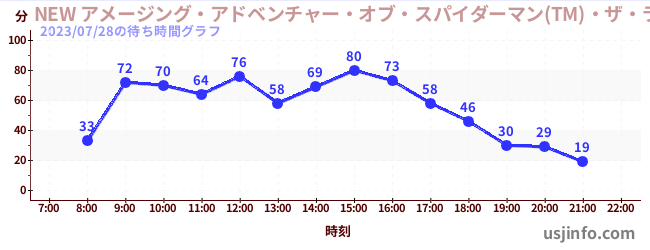 • NEW アメージング・アドベンチャー・オブ・スパイダーマン(TM)・ザ・ライド 4K3D$B$N(B2023年07月28日の待ち時間