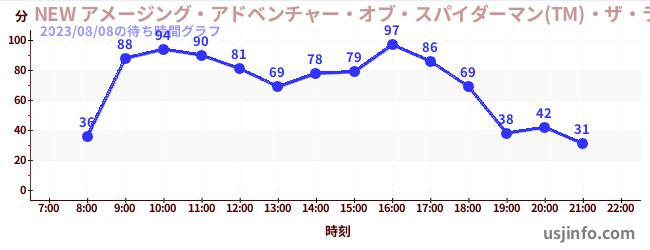 • NEW アメージング・アドベンチャー・オブ・スパイダーマン(TM)・ザ・ライド 4K3D$B$N(B2023年08月08日の待ち時間
