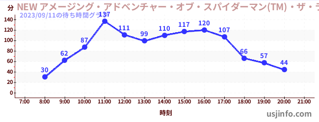 • NEW アメージング・アドベンチャー・オブ・スパイダーマン(TM)・ザ・ライド 4K3D$B$N(B2023年09月11日の待ち時間