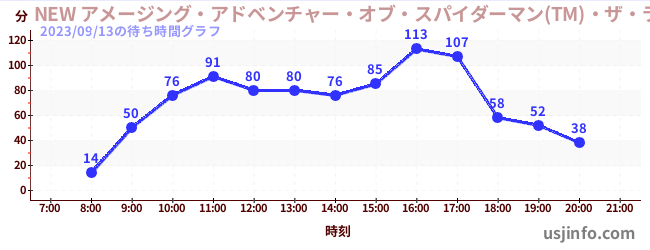 • NEW アメージング・アドベンチャー・オブ・スパイダーマン(TM)・ザ・ライド 4K3D$B$N(B2023年09月13日の待ち時間