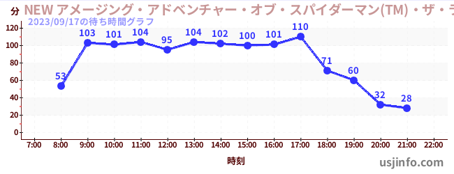 • NEW アメージング・アドベンチャー・オブ・スパイダーマン(TM)・ザ・ライド 4K3D$B$N(B2023年09月17日の待ち時間